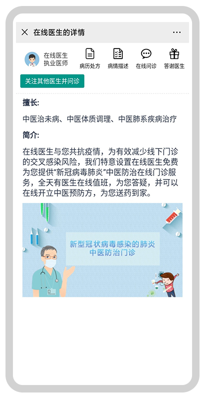 在線診療服務(wù)旨在通過在線診療平臺免費(fèi)賦能就醫(yī)體驗,讓患者在家安心隔離,避免患者對病情不清楚隨意前往醫(yī)院造成不必要的聚集性感染,從而降低感染風(fēng)險。合理利用醫(yī)療資源,進(jìn)一步讓醫(yī)療衛(wèi)生行業(yè)和廣大人民群眾都共享智慧醫(yī)療創(chuàng)新中心帶來的高效便利診療服務(wù),保障廣大患者及公眾的生命安全和身體健康。